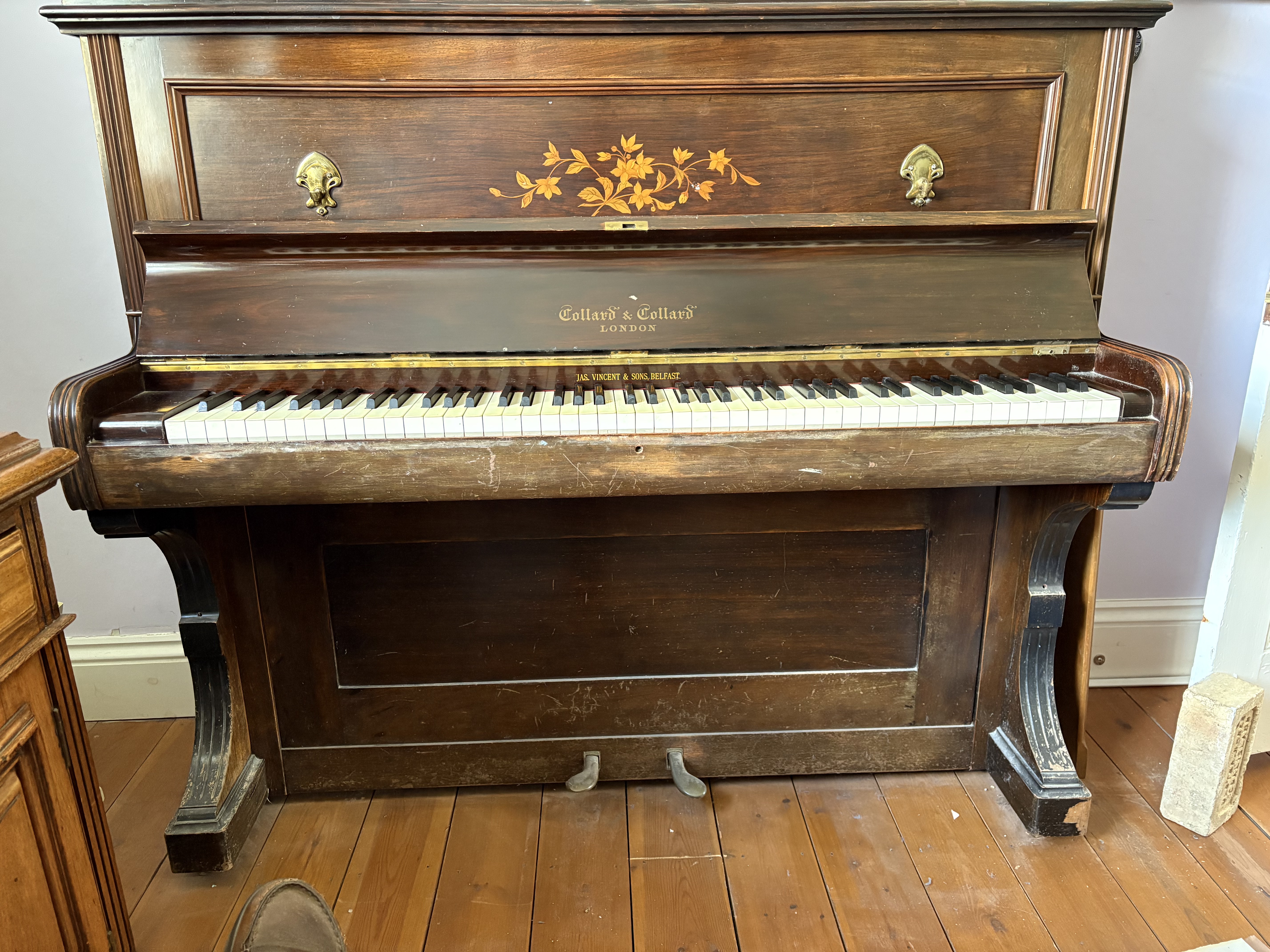 Wood inlay to front and candle holder brackets. Some wearing of varnish. Needs tuning.