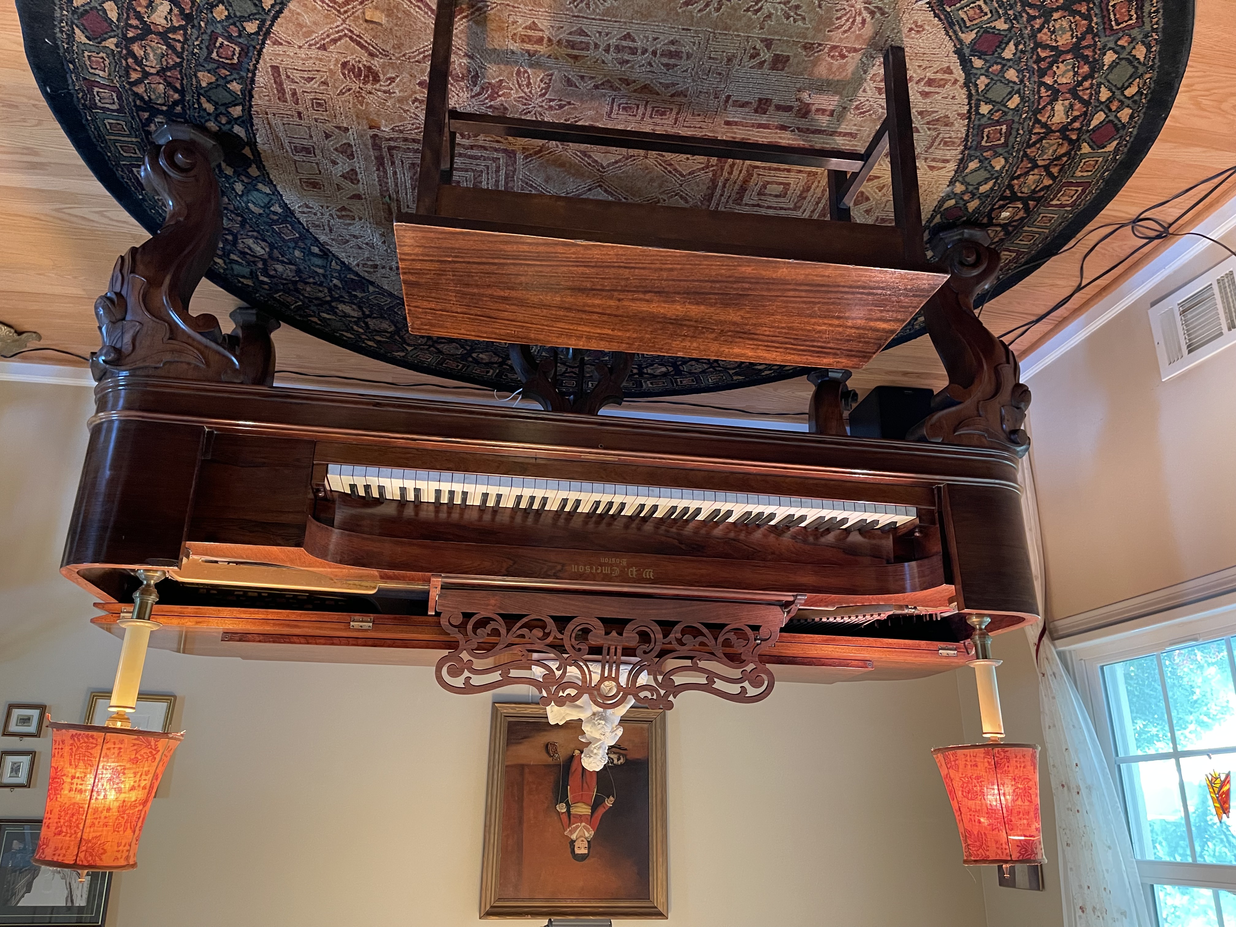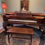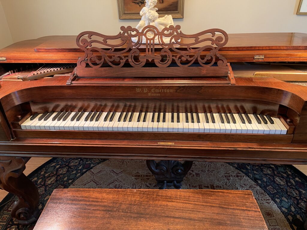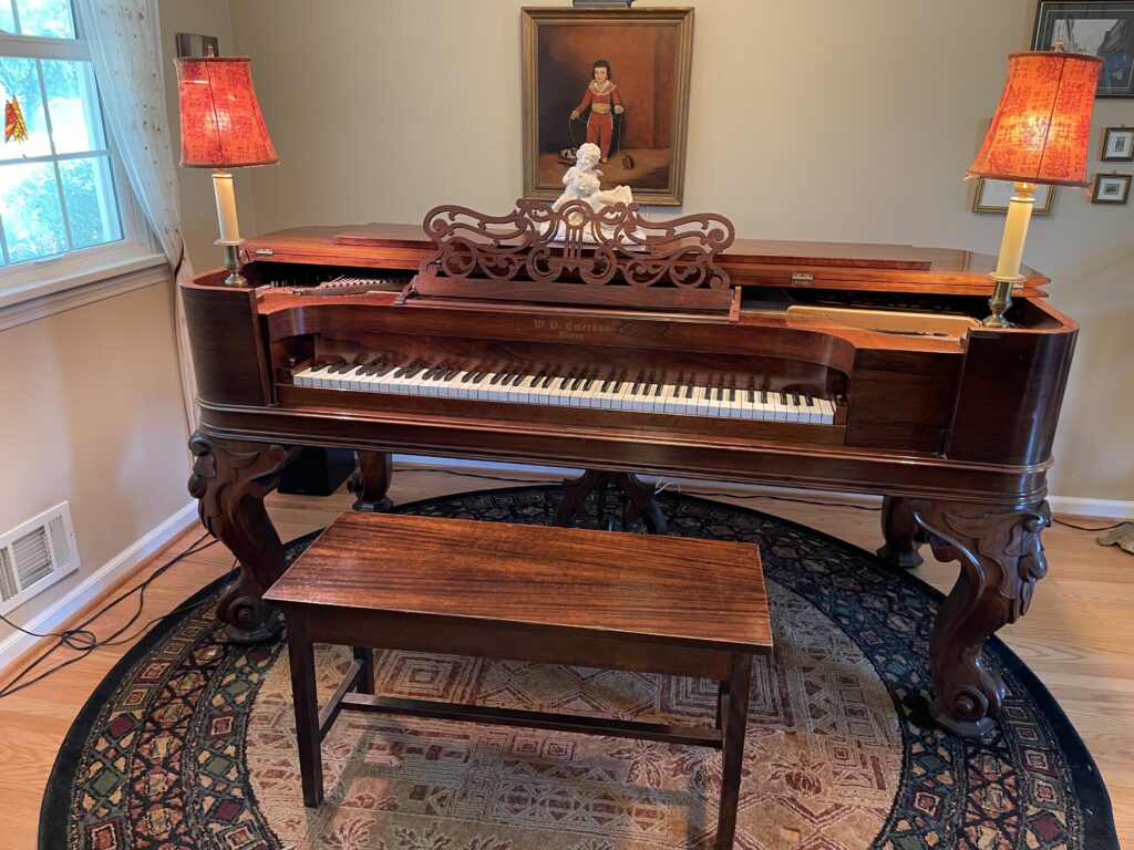 Completely refurbished (new felts, leathers and many new hammers, complete set of ivories) around 30 yr. ago. Has a couple of misaligned hammers and is out of tune but otherwise perfectly functional. Cabinet in excellent condition – no scratches or imperfections. Lovely square grand sound. Has been in my family since purchased new. Built in late 1800s.