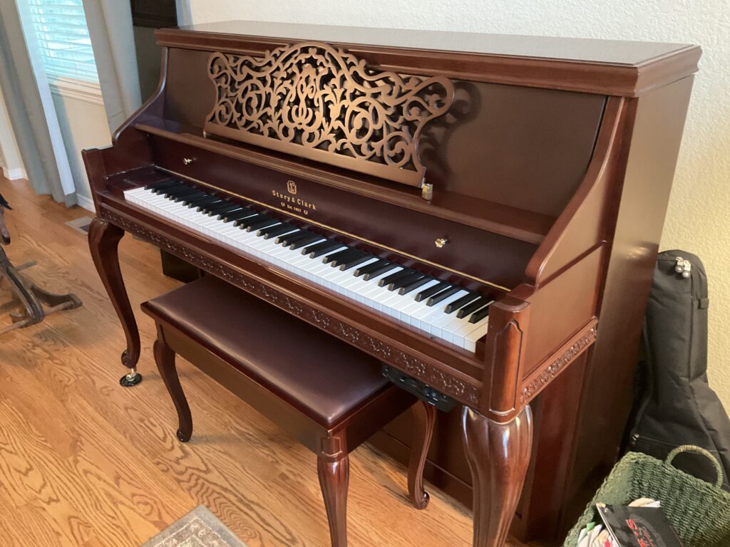 Beautiful Story & Clark upright piano with a QRS Petine Pianomation player system. Plays like a traditional piano or can perform thousands of songs automatically using the built-in CD input and flash card system.