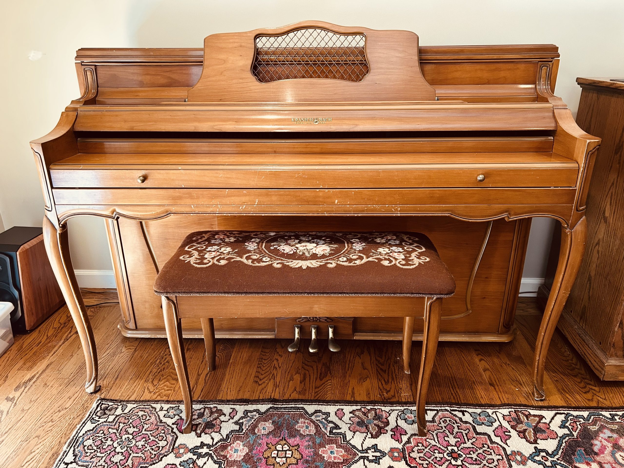 Light cherry Kranich & Bach upright piano, single owner, purchased new circa 1958. Barely used for past several decades, light usage for the first several decades of its life. Free to anyone who can come haul it away. There is one step at the front door, but no other stairs.