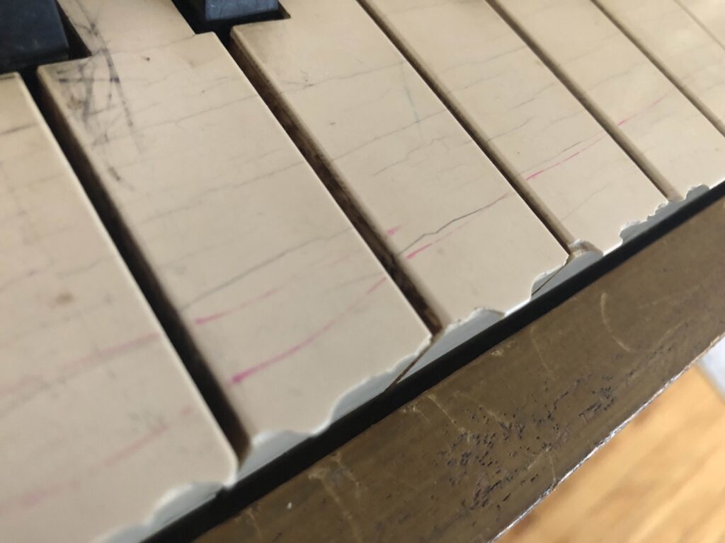 -The edges of the keys (closest to the player) have little chips in them; a toddler banged on them with a spoon. (see picture)