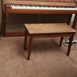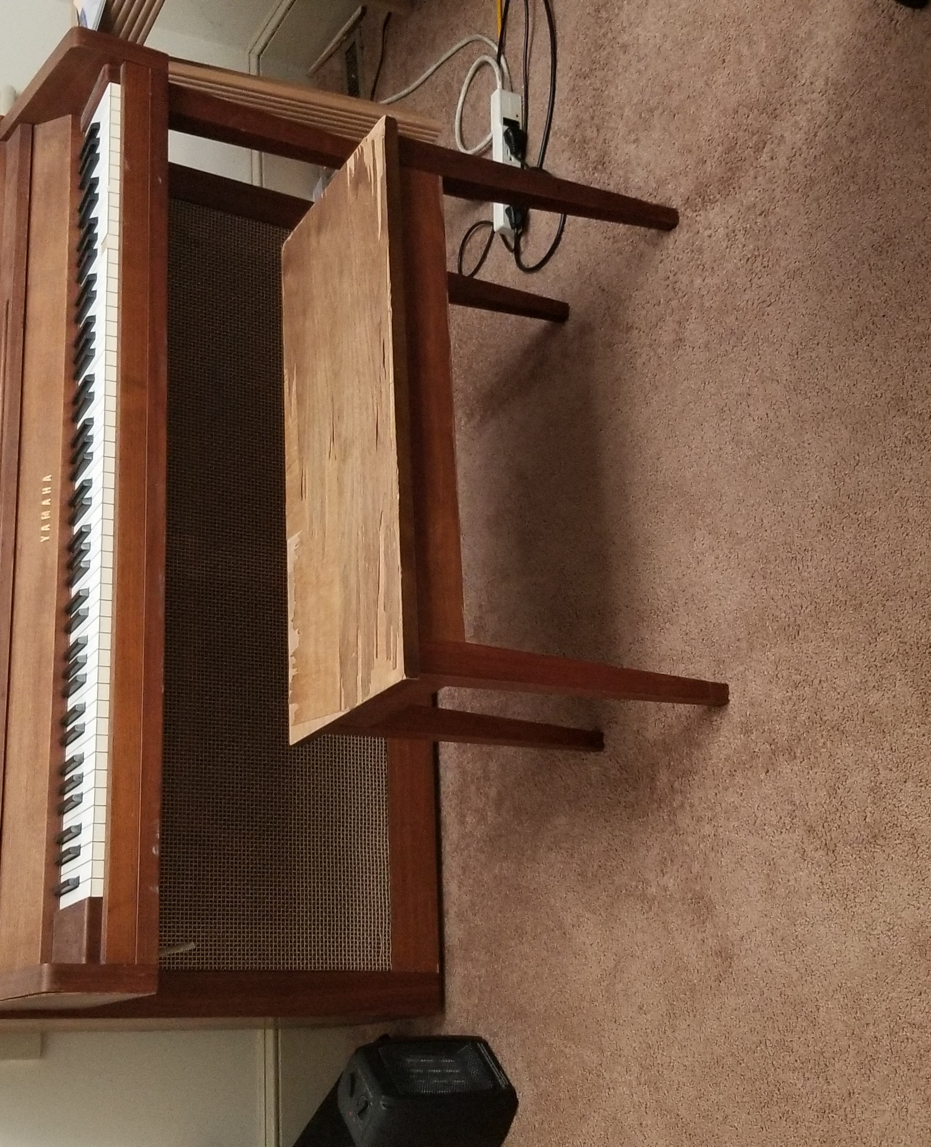 This piano plays well. It needs the left leg place back on it. The leg is available to put on the piano. The piano is walnut brown. The minor defects doesn’t affect the piano’s performance. Comes with bench. The bench’s wood is chipping a bit.